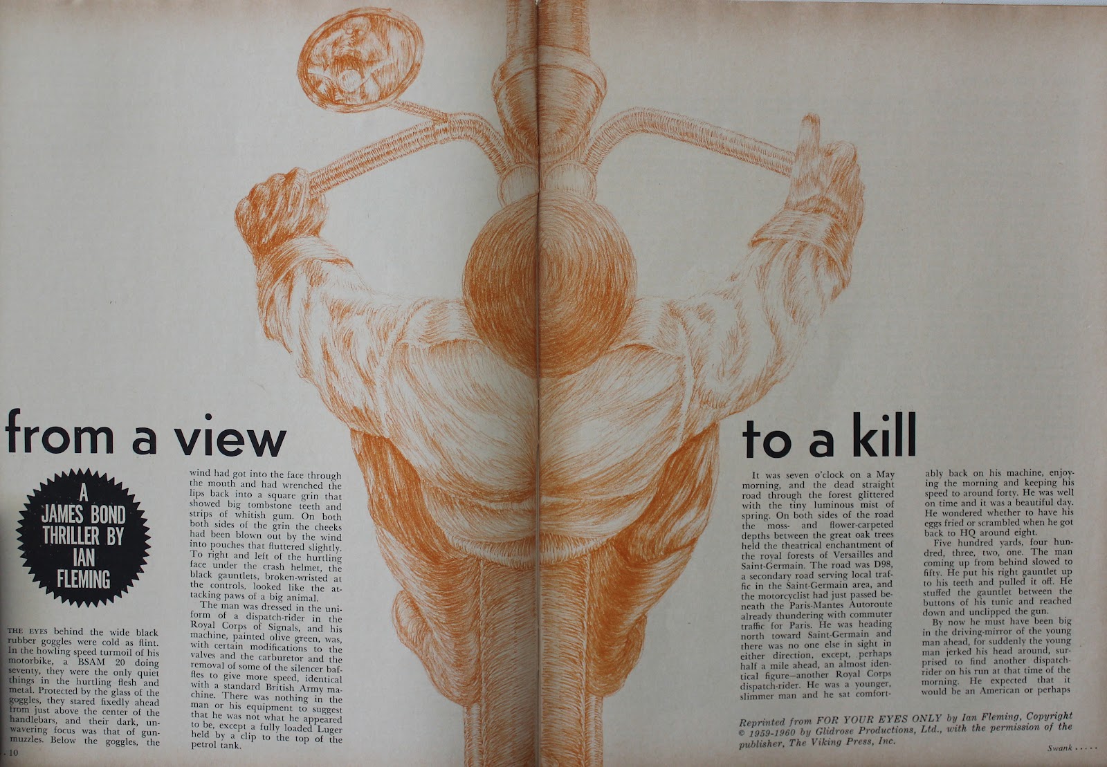 I started reading Ian Fleming when I was twelve- long before I saw any of the films. I can’t remember which title was first. I just remember that I suddenly spent my saturdays combing bookshops and I was constantly reading 007 (my routine hasn’t changed). Now that I’ve read them over and over, the titles I return to most often are For Your Eyes Only and Moonraker. I enjoy Moonraker for those sensual descriptions of food, action and mystery, and for Bond’s sweet affection for the heroine. From a View to Kill is a fantastic little mission and contains some of Fleming’s best lines (I collect odd editions of this short story, especially).
