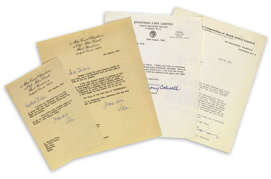 Realized $57,600 against a presale estimate of $12,000-$18,000. Photos courtesy Swann Auction Galleries. The archive of letters between Fleming, Richard Chopping, and others involved in the production of nine of the 007 covers between 1957 and 1966 — from From Russia, with Love, through Octopussy and The Living Daylights — touch on details about the jacket art, praise for Chopping’s work, payment information, copyright issues, and other related topics. Together, 62 Letters including: 12 Typed Letters Signed by Fleming to Chopping; 9 Letters from Chopping, mostly copies, including one carbon and one fair copy to Fleming; and 41 letters to Chopping by others, including one of the directors of Fleming’s publisher Jonathan Cape Limited, Fleming’s secretary, and others involved in the production of the books and Chopping’s dust jacket designs. Single 8vo sheets. Mostly London and Essex, 1950s-60s