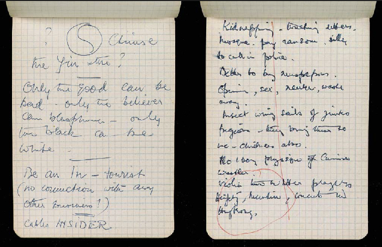 While jaunting around the hottest spots of Japan with Hughes, Fleming kept this notebook. Along with hotel and restaurant addresses, phone numbers, and simple Japanese phrases, the notebook contains several long prose passages. Philosophical jottings on the people and culture of Japan, include the followning: How many of one’s own nationals want to live in another country & how many of that country want to live in yours. Moshimosh = hello! Only the good can be bad – only the believer can blaspheme – only the black can be white. Flower – known as the FL service – or to the subs as FLOPPO.