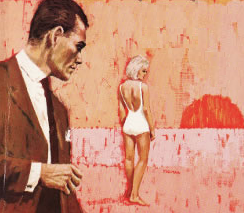 After Thunderball, Fleming made a dramatic right turn with The Spy Who Loved Me. Bond shows up as a knight in shining armor (“he had come from nowhere, like a prince in the fairy tales”) but a human, fallible one: he’s grown even more squeamish about killing in cold blood. “Never been able to” he tells Vivienne. (Really? Then how did you become a Double-O?). At times he looks borderline incompetent, and knows it—“Sorry again, Viv! My reactions don’t seem all that smart tonight. I’ll do better.”