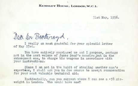 That idea had originated with Geoffrey Boothroyd, a genuine expert, and since the article appeared I’ve had hundreds of letters from weapon maniacs—and they are maniacs; it’s terrifying—and Boothroyd gets all those letters sent on to him. I never look at them; he deals with them himself or he doesn’t. I wouldn’t dream of attempting it. I’m just not sufficiently expert.