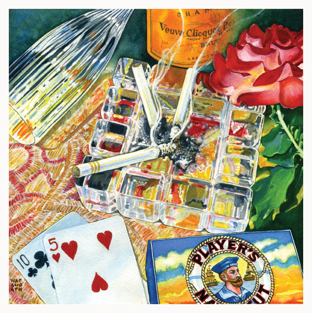 Thanks, David, for your feedback and praise! I always forget to have the unfiltered Morlands in the paintings – must be some holdover from my Dad smoking unfiltered Camels during breakfast, lunch and dinner when I was growing up. I barely survived the smoke! I thought seriously about the Beretta with skeletal grip, but I liked the design and shape of the PPK more, from a graphics perspective, and I didn’t get my dad’s old Adonis “Ronson” lighter until after he died, so this painting had a vintage mother-of-pearl-sided lighter by A.S.R. company.