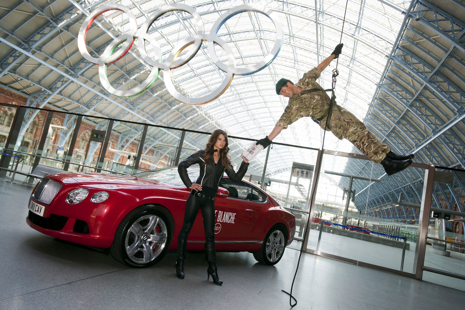 The media campaign buzz generated around Jeffery Deaver’s Carte Blanche culminated in an invite-only event at St. Pancras Station in London on 25 May 2011. This included a Carte Blanche labeled Bentley, stunt woman as well as model and actress Chesca Miles acting the part of the main bond girl. Royal Marine Commandos abseiled from the roof of the elaborate station to hand Deaver a copy of the novel as he unveiled it to the world’s press.