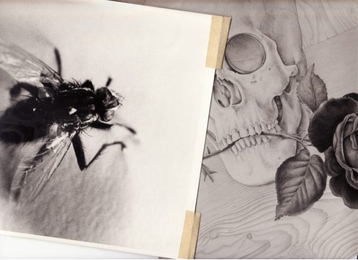 Alongside saving the physical still-life objects of the Bond jackets, Chopping also amassed torn sheets all ripped from newspapers and colour supplement magazines of guns, brightly coloured flowers and roses, dragonflies, flies, wood grain and knives, all of which have been kept and can be pieced together to see from where the exact inspiration was extracted. Reference: “The skull was given to me by Dr Kershaw”.