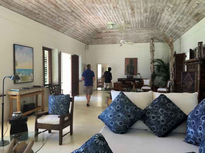 Blackwell bought Goldeneye and the surrounding 20 acres or so in 1976 from Bob Marley. Blackwell began adding additional villas to the estate in the late ‘70s ostensibly for family and friends to stop by, stay a while, and enjoy. Never one to miss an entrepreneurial opportunity, Blackwell added further villas and amenities and opened the Goldeneye resort in the 1990s. He has more than doubled the original acreage, some of it on reclaimed land, and has built additional villas and cabanas each with their own access to beach or lagoon. Along with Fleming’s villa with its two adjacent villas and the converted garage which all combined can now sleep 10, the resort comprises 8 one and two bedroom ocean front beach villas, 3 lagoon villas, 8 one bedroom lagoon cottages and a lagoon hut, 3 one and three bedroom ocean front villas, and 26 beach huts. The resort can accommodate about 200 guests at its maximum capacity.