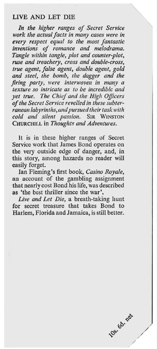 Live And Let Die(1954) – A2a. Three variations, all on the DJ. The 1st state DJ front flap has no acknowledgement for the artist – A2a(1.1). The 2nd state DJ is overprinted in a centred smaller font ‘Jacket devised by author / and executed by Kenneth Lewis’ -A2a(1.2). The 3rd state DJ has been newly-printed and the same words as for (1.2) are now aligned left in the same size font – A2a(1.3); occasionally there’s a bleed of purple onto the front flap. This is all confusing, but generally there are differentials in price, with (1.1) being the most collectible, though the 2nd and 3rd states, and the purple bleed, are also collectible.