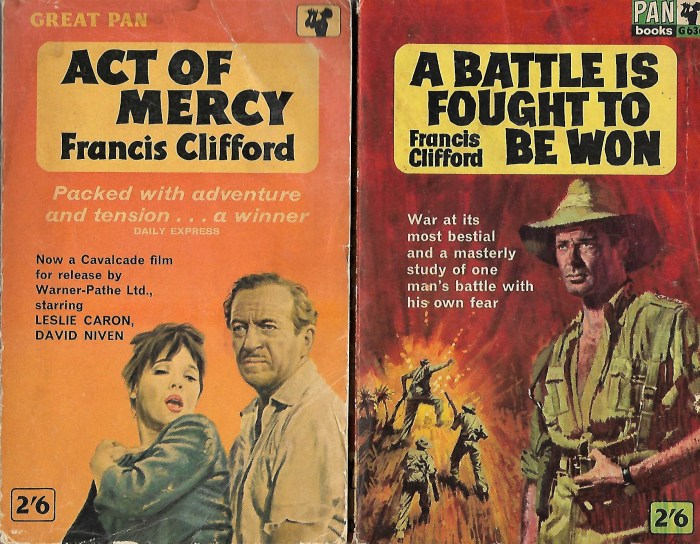 Clifford came to prominence in 1959-60 with his thriller Act of Mercy (filmed as Guns of Darkness) followed quickly by A Battle is Fought To Be Won, which took the author back to the war in Burma in a powerful novel of brutal combat and cowardice. It caused something of a sensation due to its uncompromising descriptions of violence and torture and probably had a cathartic effect on the author, who never returned in his fiction to the jungle war that had so strongly affected him.