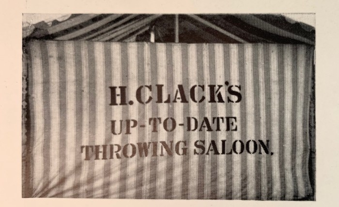 A throwing saloon was traditionally a large tent where wooden balls were thrown to dislodge coconuts, and the Clack family (and this might be Henry Clack) were well known in the fairground fraternity.
