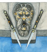 The stone lintel at the top with the grotesque face and pair of switchblade knives (flick knives, in the story) represent Kristatos and the “dark side” of the smuggling operation.
