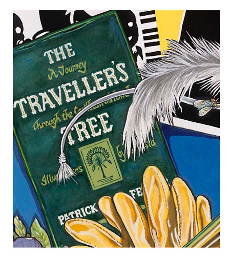 The counterpoint to the beauty of the music would be the horrifying cult of Voodoo, used by Mr. Big to achieve his evil aims. M tells Bond to read Patrick Fermor’s book on Voodoo, “The Traveller’s Tree” – so I added that to my list of items to paint. Solitaire gives Bond numerous insights into the cult and the description of Mr. Big offers more to the reader (and artist). I chose the pair of lemon yellow gloves that lay at the base of Lord Samedi’s iconic throne of cross and top hat, and added two white chicken feathers for visual counterpoint. To the end of the white ivory whip used by Mr. Big to chastize Solitaire, I added the single Russian letter that stands for SCH, the first letter of Spion – a spy – that was carved into Bond’s hand in Diamonds are Forever. The addition of these elements inspired me to add Voodoo to the title of the painting – which now became “A Mecca of Voodoo, Jazz and Jive.”