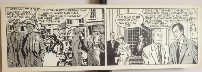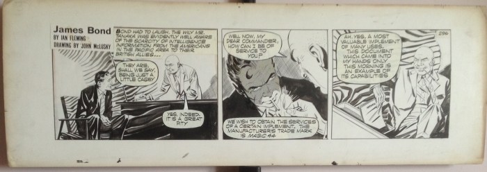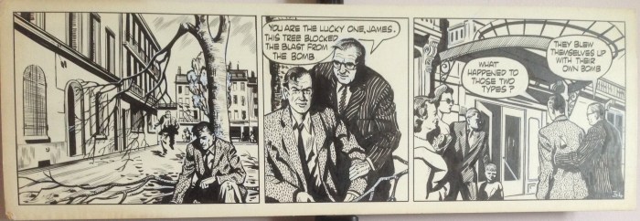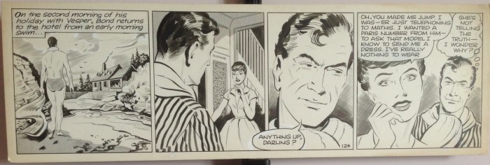 This was the very first strip cartoon of Ian Fleming’s James Bond which appeared in the Express from July 1958 to December 1958. The writer was Anthony Hearn. Approximate sizes:18″ x 5″